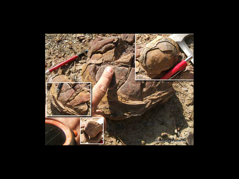 En la imagen central de la fotografía, se pueden apreciar formas poligonales (alguna pentagonal) y redondeadas que aparecen independizadas. En cada una de ellas se puede observar una capa de 0.5 mm. aproximadamente que se encuentra envolviendo a otro material de diferente composición al de la envuelta. El conjunto, que tiene un diámetro aproximado de 30 cms., se encuentra a su vez rodeado por varias capas como se puede observar en la fotografía, deduciéndose una forma ovoidal para el conjunto.